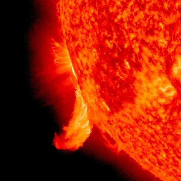 于此同时,美国国家航空航天局已经在太阳周围部署了包括日地关系空间天文台和太阳动力学空间天文台在内的空间探测器,一旦出现强太阳风暴的爆发,地面控制中心的计算机将会立即形成一个3D的模型,预测出太阳风暴的袭击路径,可以精确到各个行星以及地球上哪些地方或者哪些轨道的卫星在哪个时间段将受到太阳风暴的正面冲击。而图2显示的是一个太阳表面特写的镜头,2011年6月16日太阳动力学天文台在极紫外波段下拍摄的太阳部分活跃区域,显示了太阳表面6000度环境下的电离态氦分布情况,以及等离子喷流从太阳表面喷射出而隐匿的过程,持续时间超过13个小时,此外该区域周围还存在着许多小型喷流产生的斑点。
