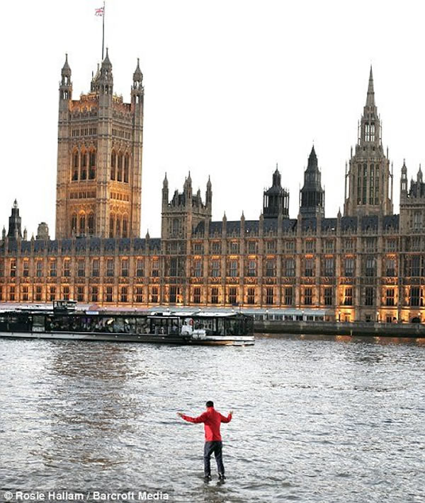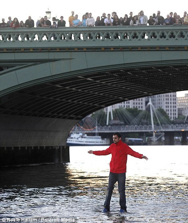 这名28岁、来自布拉德福德(Bradford)的魔术师史蒂夫-弗拉伊内(Steve Frayne)艺名为“发电机”,他在伦敦议会前泰晤士河的河面中央当众表演了踩水而过的魔术,步伐漂亮、轻健,如同“凌波微步”,引得过路人纷纷围观。不过,随后他被巡警开船带走。