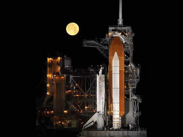 2009年3月,“发现号”航天飞机停靠在美国宇航局肯尼迪太空中心39A发射台准备发射,一轮圆圆的月亮映衬在夜空之中。