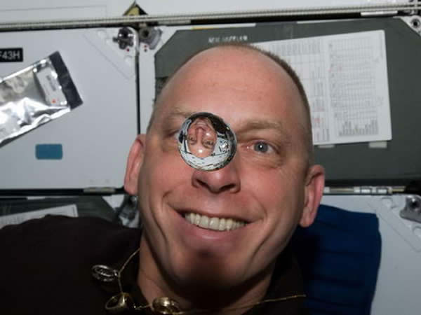 2010年4月,宇航员克莱顿-安德森飘浮在“发现号”航天飞机的中层甲板上。在他眼前是一个漂浮在空中的水滴,由于光线折射效应,可从水滴中倒映出安德森的面孔。
