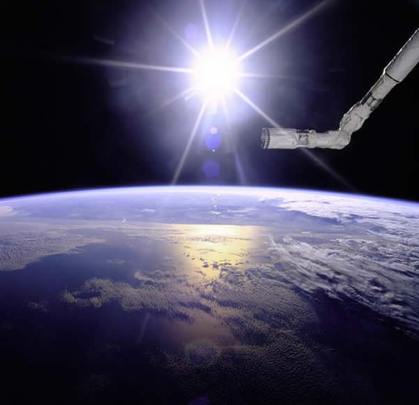 球状地球位于太阳光之下,“奋进号”航天飞机的机械手臂漂浮在顶部右侧。这张照片拍摄于1996年奋进号航天飞机执行的STS-77任务。