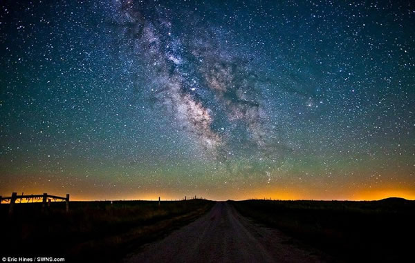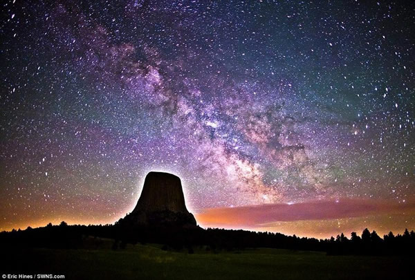 20岁的摄影师埃里克海因斯拍摄了一组美国魔鬼塔上方天空美轮美奂的星系光带图片,这些美丽星系群和七彩光像极了1977年的电影《第三类接触》中的场景。