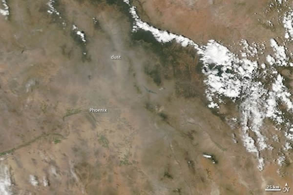 当第二天美国宇航局“大地”卫星(Terra)中分辨率成像光谱仪(MODIS)拍摄这张真彩色图像时,仍然能看到前一天沙尘暴的残余。图像上可以隐约看到一条长条形的灰黄色条带,其中最浓密的尘埃带位于凤凰城东北方向。