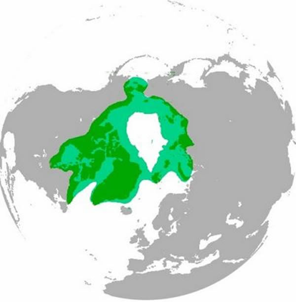 图中绿色区域显示的是北极熊当年在北极圈附近的“遛达”区域