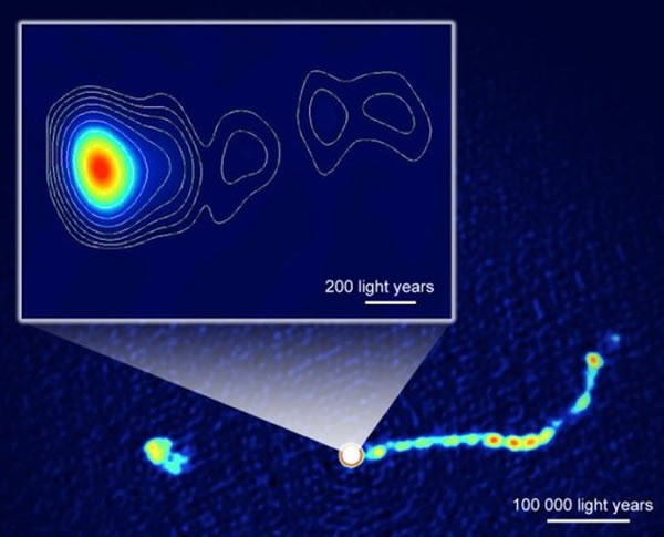 位于澳大利亚西部的国际射电望远镜阵列观测到距离地球75亿光年远的宇宙空间出现一排链状斑点,这些斑点被证实是由一个神秘的类星体所发出的超级无线电喷射流,该喷流不仅呈现“珍珠项链”似的结构,而且还贯穿了10万光年的宇宙空间,每个斑点的跨度可以达到200光年。天文学家推测这个类星体的背后是隐藏着两个巨型黑洞,并绘制了其内部喷流区域的毫角秒尺度的精细结构。