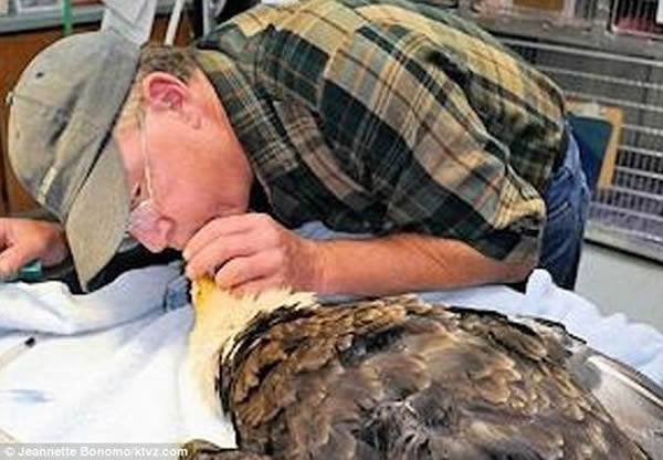 这名采用人工呼吸方法抢救白头鹰的兽医名叫杰夫库尼。这只白头鹰在恢复后被当地人取名为“爱国者”。