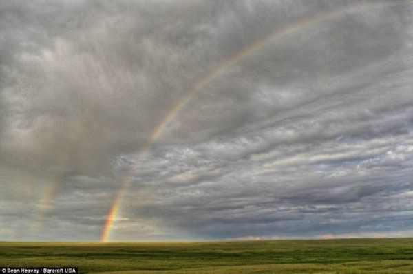 肖恩为了捕捉风暴最令人惊叹的时刻,例如这张大草原上空的雨虹画面,不惜驱车行驶数百英里