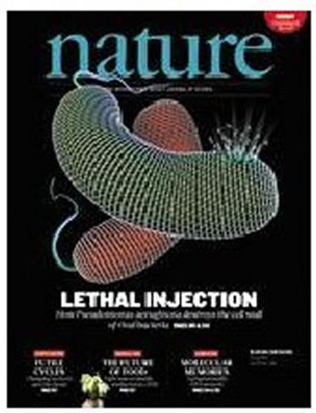 “VI型分泌系统”(T6SS)是一个蛋白输出机器,存在于大约四分之一所有已测序的细菌中。细菌能利用这一系统来以一种依赖于接触的方式向其他细菌细胞提供有毒效应子蛋白。然而,这些蛋白在到达其目的地之后做什么在很大程度上仍不知道。现在,研究表明,“机会主义者”人病原体“绿脓杆菌”利用其T6SS来杀死竞争对手“革兰氏阴性细菌”,其方法是向其注射两种肽聚糖降解酶:效应子蛋白Tse1和Tse3。“绿脓杆菌”通过表达能与这些效应子相结合的免疫蛋白来保护自己不受其影响。本期封面上描绘了细菌之间的一场冲突。从一个供体细胞(红色)输送到一个受体细胞(绿色)的T6SS效应子蛋白使细胞壁降解,导致受体细胞的肽聚糖层中出现一道裂缝。“决斗”中的“革兰氏阴性细菌”的外膜没有在图片上显示出来,所以其下面的肽聚糖层是可以看得见的。