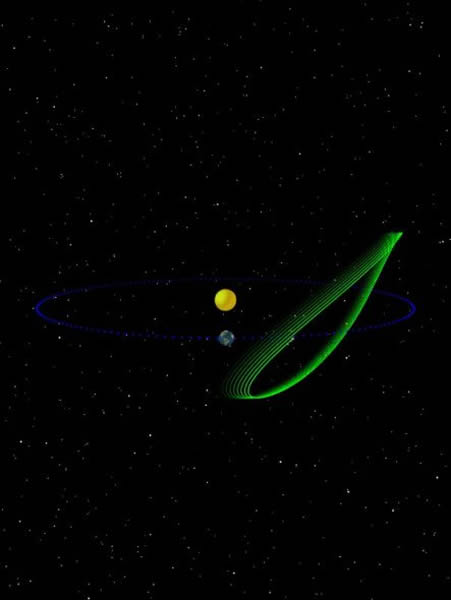 这张图像呈现了侧向看到的地球轨道以及用绿色线条标示出的小行星2010 TK7在未来数年内的轨道位置。这颗小天体由美国宇航局WISE探测器发现,现在已经被确认为首颗证实的地球-特洛伊族小行星,位于第四拉格朗日点。