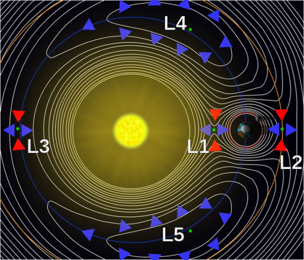 为了给读者一个有关地球-特洛伊族小行星的清晰图景,请想象一个等边三角形,地球和太阳分别位于其中两个端点上,而这第三个端点便是所谓的“特洛伊点”(Trojan point)或者称拉格朗日点,这是以著名的法国数学家拉格朗日的名字命名的,他首先推导出了这种特殊点的存在。这种和地球和太阳呈现等边三角形关系的点一共有两个,分别位于地球轨道前进方向的前方(称第四拉格朗日点,即L-4)和后方(称第五拉格朗日点,即L-5)。