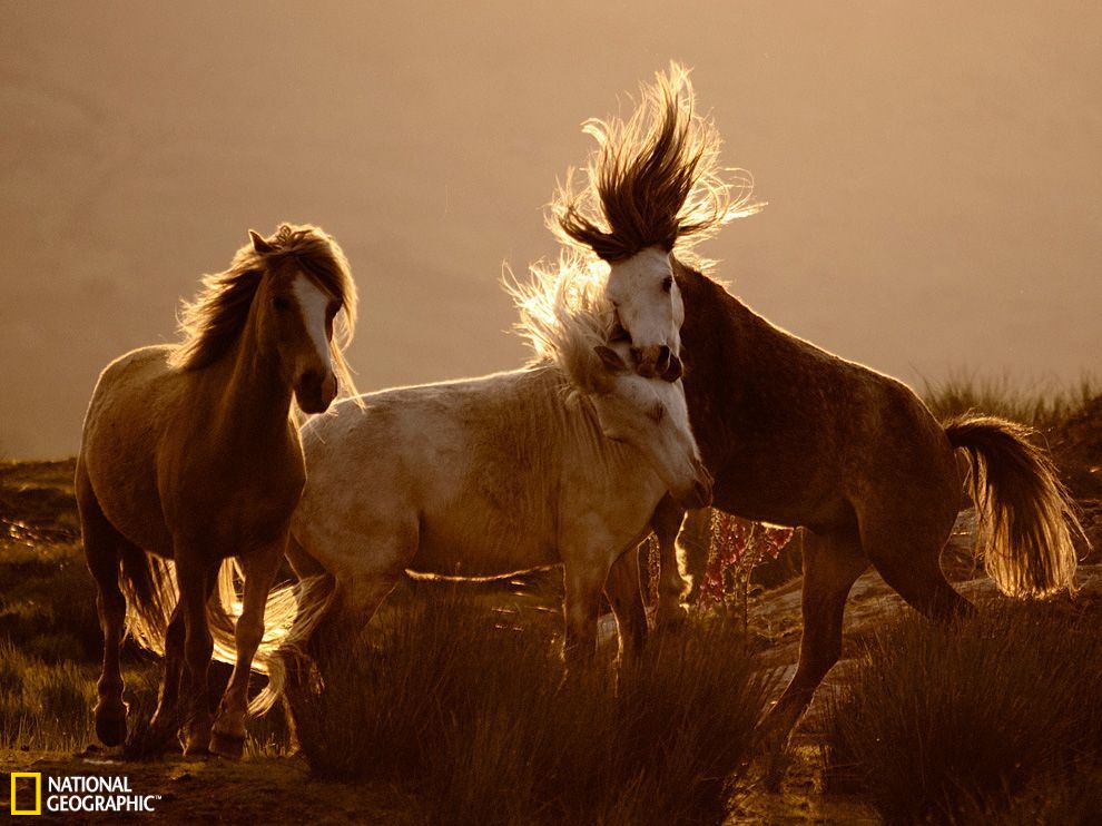 斯诺多尼亚国家公园太阳余辉下嬉戏的马
