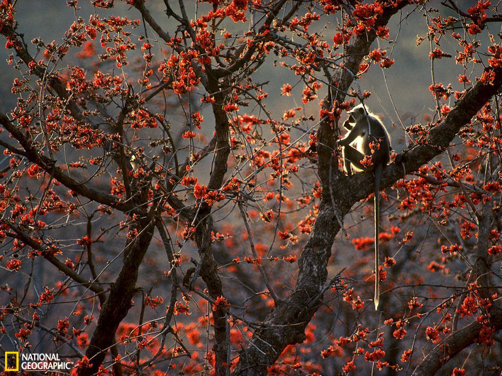 印度伦滕波尔森林长尾叶猴享受美味红花