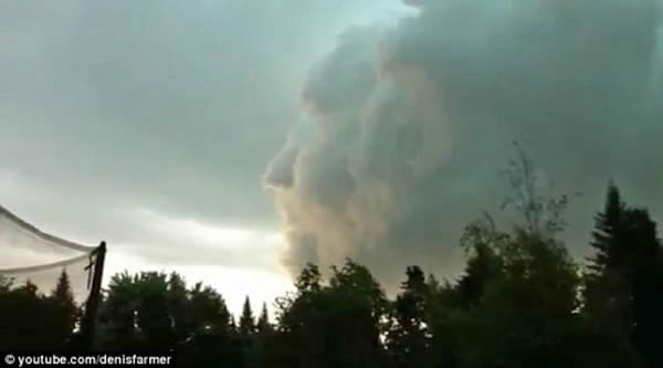 摄影爱好者丹尼斯-法梅尔在加拿大的自家后院里捕捉到这些由乌云构成的令人难以置信的画面。他上传到YouTube的视频显示,黑暗的天空中突然浮现一个巨大的人脸,它随疾风迅速向前移动。这个侧脸轮廓分明,可以清楚看到尖挺的鼻子、一只眼睛和显然正在微笑的嘴巴。风暴从他头顶翻涌而过时,非常吃惊的法梅尔激动的大喊:“人脸!那是个人脸!太令人不可思议了。”