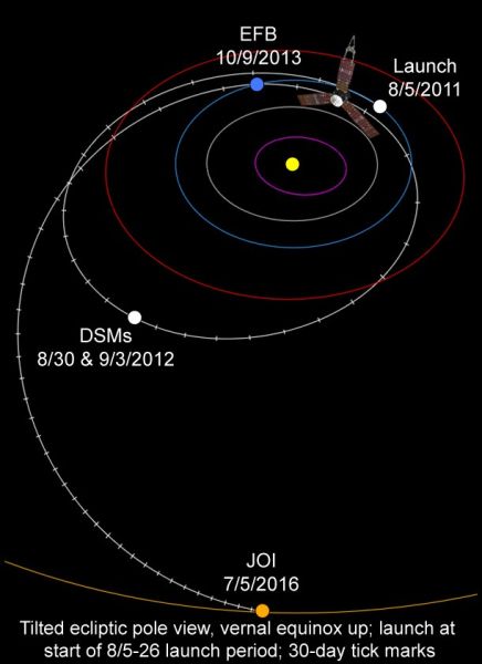朱诺的飞行轨道路线,其中可以看到2013年10月9日,朱诺飞船将再次返回地球进行借力加速,图中以EFB(Earth Flyby)表示