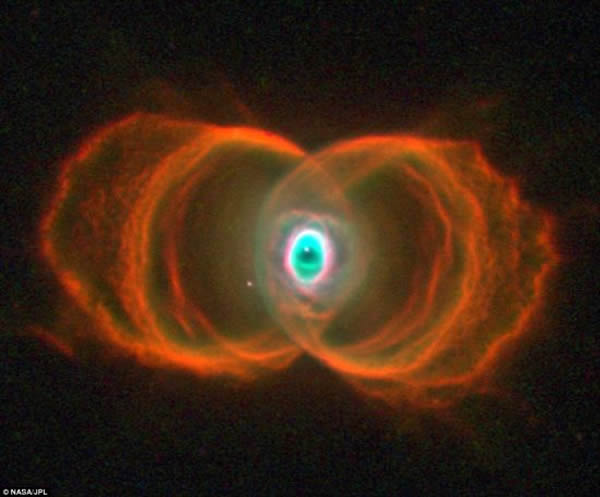 沙漏星云的形状像个沙漏,位于南天的苍蝇座,这颗类似太阳的恒星的内核正在逐渐冷却,慢慢变成一颗白矮星。20世纪90年代中期,天文学家利用哈勃太空望远镜拍摄到该星云的很多图片,其中包括这张。红色氮气、绿色氢气和蓝色氧气这些彩色发光气体组成的环状物构成沙漏壁。哈勃图片的惊人清晰度,向人们展示了沙漏星云喷射的详细过程。这有助于科学家揭开行星状星云的复杂结构和对称性之谜。