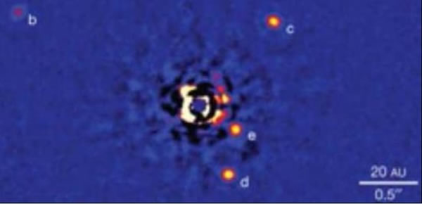 图2中所示的是HR 8799行星系统,中央恒星距离太阳大约128光年左右,具有1.5倍的太阳质量。整个系统到目前为止发现了四颗行星。较早发现的HR 8799b、c、d三颗行星轨道半径为24、38、68AU(AU为天文单位),第四颗HR 8799e行星是具有7倍木星质量的巨型气体行星。通过对凯克II望远镜红外自适光学系统辅助观测下,科学家可以检测这些系外行星的大气属性。