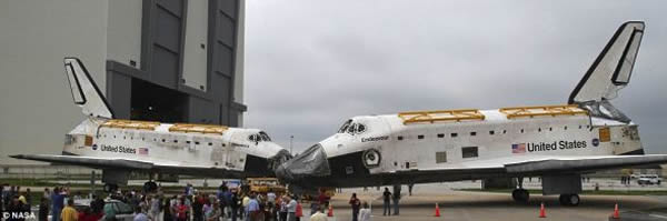 昨天,肯尼迪航天中心,发现号航天飞机(右侧)和奋进号航天飞机排成难得一见的面对面姿态