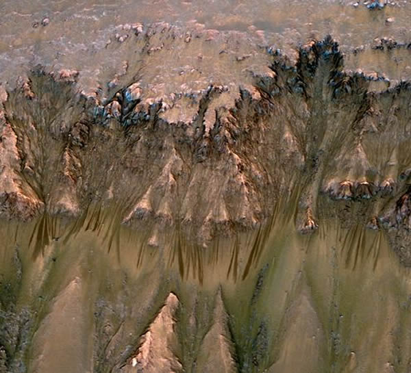 一幅数字增强图片,原照由美国宇航局的火星侦察轨道器拍摄,4日对外公布,展现了火星“牛顿”陨坑内的暗纹。原照经过处理后展现斜坡的3D景象,就好像在一架处在陨坑内的直升机上看到的一样。根据火星侦察轨道器对火星表面进行的观测,南半球多个地区存在类似斑纹。在温暖的季节,斑纹亮度更暗,较冷的季节时逐渐退却,暗示着火星的季节变化较为活跃。斑纹可能由液态水流产生。