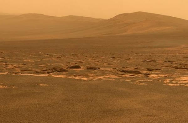 一幅合成图片,由美国宇航局“机遇”号火星车8月6日拍摄的照片合成,展现了“奋进”陨坑南部边缘西侧。照片的颜色未经处理,帮助“机遇”号项目组对人类肉眼可能看到的火星景象进行最准确的评估。过去3年时间里,这辆强悍的火星车一直朝着直径14英里(约合22公里)的“奋进”陨坑进发。任务管理人员证实“机遇”号已于8月9日抵达“奋进”陨坑边缘。
