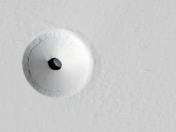 今年早些时候,正在火星轨道运行的美国宇航局火星勘测轨道器(MRO)拍摄到火星帕沃尼斯火山尘埃遍地的山坡上有一处黑点。随后科学家们调用该探测器上搭载的“高分辨率成像科学实验”相机(HiRISE)进行精细成像,并发现了这一不寻常的地物。