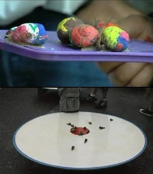 有的参赛蜗牛被涂上了幸运色;蜗牛从桌子中间开始朝外爬,最快爬到桌子边的蜗牛获胜