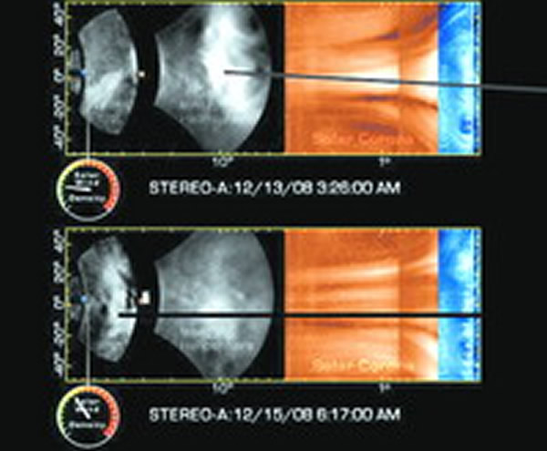 这一新的分析工具剖析了5台照相机所采集的数据——这些照相机装载于在远离地球的轨道上围绕太阳运行的一部探测器上,从而赋予了科学家从日冕物质抛射在太阳大气中爆发(上图)到它们到达地球附近(下图)的整个过程中追踪这一事件的能力。