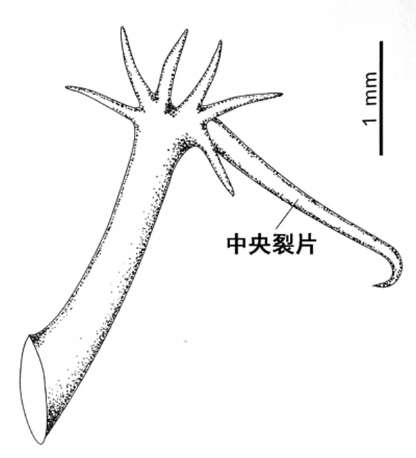 在徐洪河的办公室里,记者见到了新疆莱氏蕨的化石。据了解,它的“身材”比普通莱氏蕨更为“苗条”。它的茎干长不到3毫米。“但是它的叶片总长有5毫米,”徐洪河说,之所以叶片可以比茎干还长,就是因为“另类”的叶片形态:除了相对粗壮的中央裂片外,其两侧的每个裂片均分叉成三枚小裂片;叶中裂片末端还有明显的钩状结构。