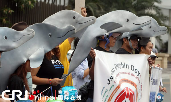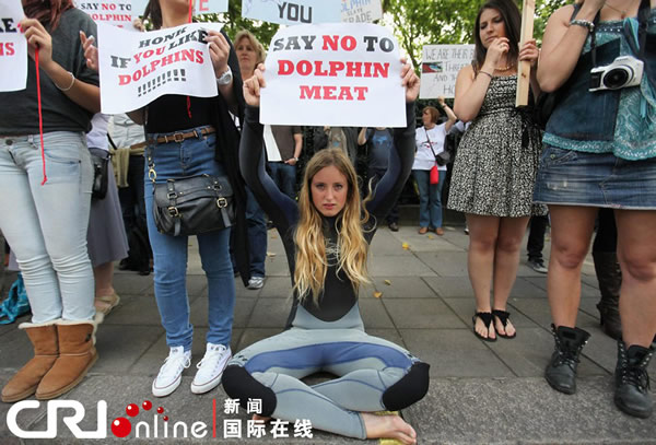 在美国华盛顿,大约数十人聚集在日本驻美国大使馆前,高举标语抗议,上面写着“海豚也想活下去”。动物权利活动家凯瑞·肖(Kerri Shaw)的身体上,贴着奥斯卡获奖纪录片《海豚湾》的剧照。善待动物组织(PETA)的凯蒂·阿尔特(Katie Arth)说,日本捕捉海豚存在牟利动机,他们会将海豚卖到世界各地的水族馆中表演。阿尔特说:“日本人捕杀海豚屡禁不止的原因在于这种举动有利可图。普通人能做的事情就是不去任何有海豚表演的场所。”