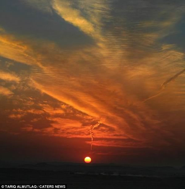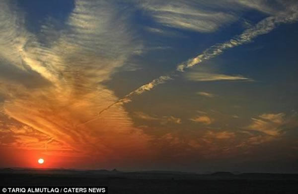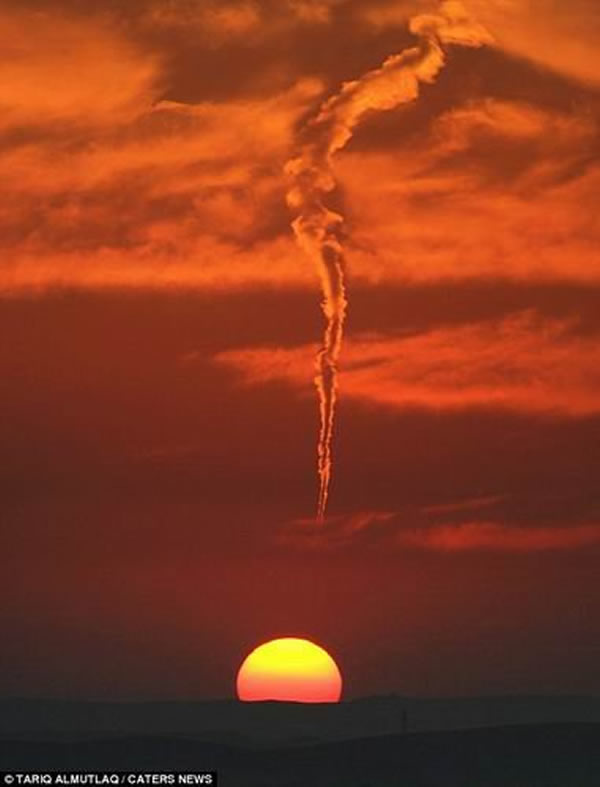 45岁业余摄影师塔力克-阿尔穆特拉奇(Tariq Almutlaq)在撒哈拉沙漠拍摄到这一场景,当时他第一反应是可能可怕的龙卷风即将到来,并准备将汽车调头开走,但很快便意识到这仅是飞机尾流气体而已。