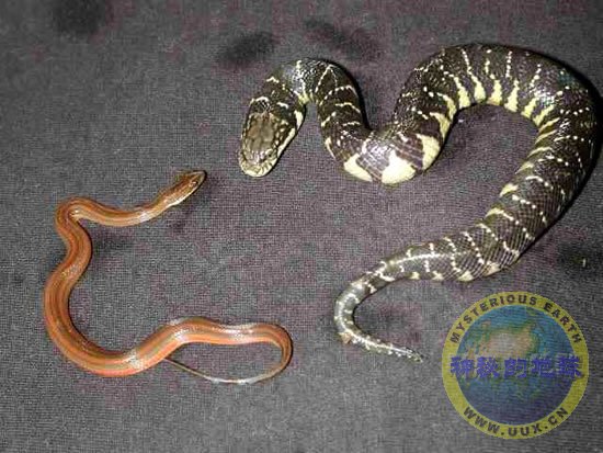 佐治亚州的野生动物技术人员发现了一条东部靛蓝蛇(右),它吐出了一条鼠蛇(左)和...