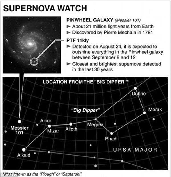 由于这颗超新星接近地球,此次超新星爆炸将非常明亮,超新星位于大熊星座风车星系北斗七星“勺柄”的东部区域。相比之下,多数超新星都距离地球10亿光年左右。