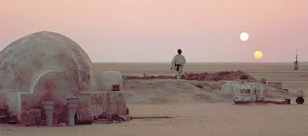 图为科幻电影《星球大战》中,主人公卢克在行星塔图因上凝望“双日同落”的经典场景。