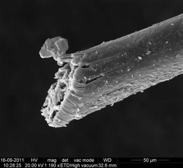 扫描电子显微镜(SEM)的头发图像,图片来自Timothy Topper。