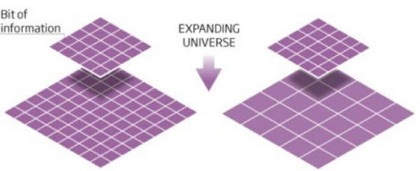 有一种方法可以用于想象宇宙的状态演化,可将宇宙想象成由无数个仅有普朗克尺度的“细胞”构成,这就如同在图像中由一个个像素所构成的一样。将宇宙想象成由最小的尺度构成是非常有意义的,这也是“可视化”想象的方式之一。一些宇宙物理学家认为:还可以用一比特的信息来描述每个普朗克尺度“细胞”的状态,虽然最后精确的数量还需要处于辩论之中。这儿问题就出现了,当我们推断这些普朗克尺度的“细胞”演化了数十亿年之后,这时宇宙在膨胀效应的作用下也会变得更大。