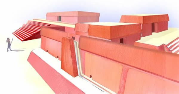 艺术家制作的一个3D复原图,处在背景的就是15号结构——充当坟墓的金字塔。在前景,14号结构前有一条排水沟。这个结构中可能也存在一个坟墓或者葬礼用寺庙,充当一个临时停尸房。不幸的是,内室已经洗掠一空,具体用途可能成为一个永远的谜。