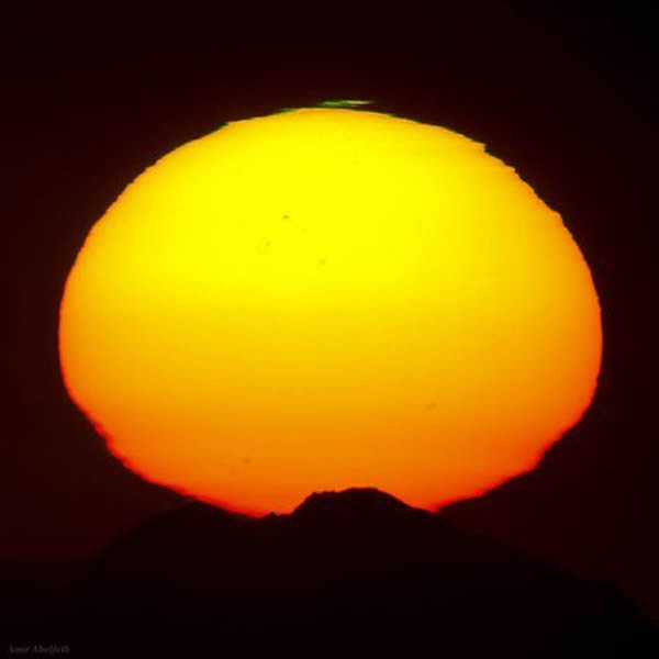 照片由伊朗扎格罗斯山上的一架望远镜拍摄,最近对外公布。照片中,地球大气层导致的光线弯曲让落日景象给人一种被挤压的感觉。这幅照片同样捕捉到太阳顶部附近的绿光。这是一种短暂的现象,在透过地平线附近的晴空观察太阳时,你能够看到这种景象。地球的大气层弯曲或者折射阳光,就像是一个棱镜。发生折射时,绿光出现的位置与橙光或者红光相比略高一些。