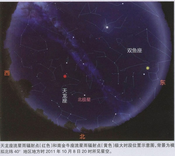 天龙座流星雨的特点就是活动时间短,从每年的10月6日到10日,我们只在这4、5天内能看到属于该群的流星。而由于极大持续的时间也很短,因此很难通过预报来确定最佳的观测时间。对于我国的爱好者来说,8日晚至9日黎明前的观测将非常有意义。当然,农历十二的盈凸月对观测的干扰不可避免。9日2时左右月亮就将落下,届时光污染的干扰将会减小,但辐射点地平高度过低的问题也随之出现。天龙座流星雨的辐射点位于“龙”的头部,对于北纬40°以北地区来说,“龙头”始终不会落到地平线以下,这也是观测该流星雨的一大利好。但10月上旬,辐射点会在日出前经过下中天,也就是地平高度最低的位置,这时我们能观测到的群内流星数目会远小于辐射点接近天顶的时候。