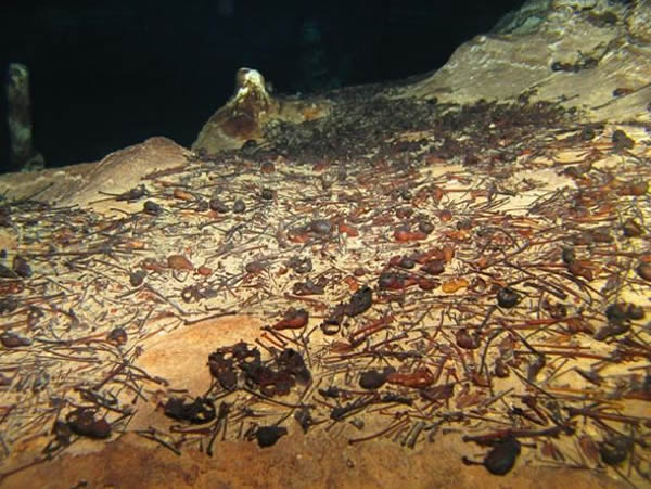 一条蛇的脊柱化石从多米尼加一多沙洞底伸出。潜水员在一些洞穴发现了猴子以及其他哺乳动物的化石,在奥列格蝙蝠屋洞,他们主要发现了鳄鱼和蛇化石。研究小组表示,这个洞穴在被水淹没前拥有与现在截然不同的生态位,可能是一片沼泽地或者沿海环境。