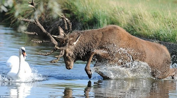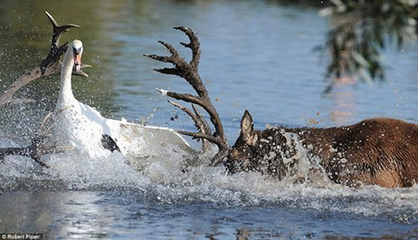 摄影师罗伯特•派柏纪录了这个瞬间。他说:“本来有两头雄鹿在小溪的两岸互相挑衅,争斗一触即发,吼叫声吸引了不少围观者。一只天鹅刚好游到它们中间。就在这时,右边一头向水中冲去,刚好冲向了这只无辜的天鹅。紧接着左岸的雄鹿也跳下水,这下两只鹿的角即将把天鹅抵在中间。就在这千钧一发的时刻,天鹅突然潜下水,安然无恙地躲避了这次劫难。”