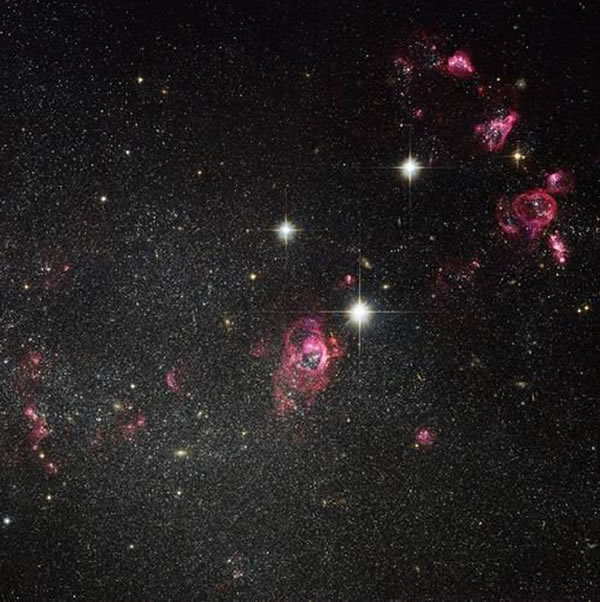 研究人员称,这种复杂的气体泡散布在整个星系是超新星爆炸存在的证据。从超新星释放的冲击波贯穿哈姆博格II星系,加热星际气体,并形成壮观的发光气体泡。