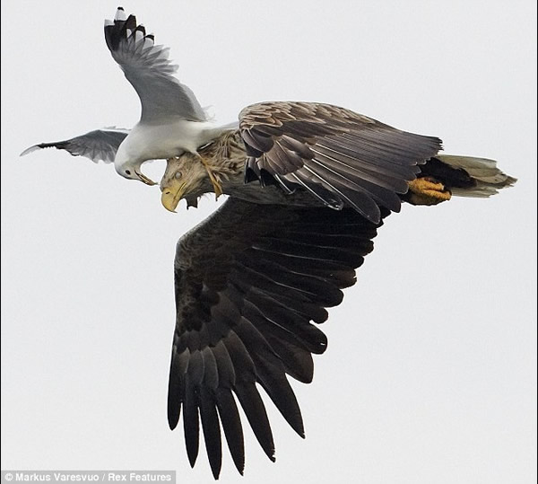 据英国《每日邮报》网站10月6日报道,45岁的芬兰摄影师马库斯·瓦雷斯沃近日出版了一本新书,首次向世人展示了他拍摄的一些精彩照片,其中一幅记录的是海鸥骑跨在一只正在飞翔的白尾海雕头上,并对其展开攻击的场景。
