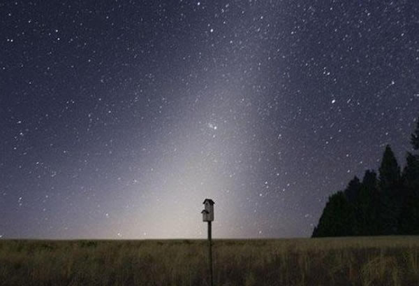 在接下来的半个小时后,神秘辉光仍然明亮,高度继续升至狮子座恒星位置,从地平线上方一直接近天顶处。这个情景有点儿像山脉附近突然出现一个小城镇或者一个遥远的城市瞬间接近,产生出某种光线投射到天空中。这个时候距离黎明还有至少一个小时。这个现象就是神奇的“黄道光”。