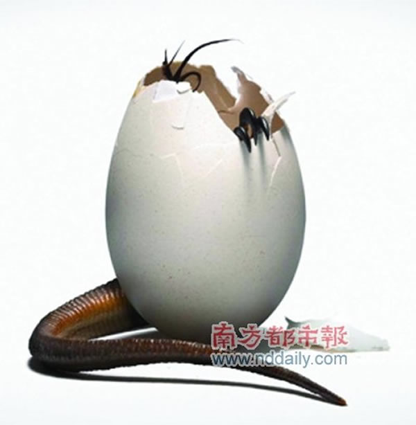 他告诉T E D大会的听众,现在,要把他的想法变成现实,只需要发育生物学和遗传学的几个突破,还需要很多很多的鸡蛋。他说,“我们要做的,是对鸡进行改造,创造一只‘鸡龙’。”