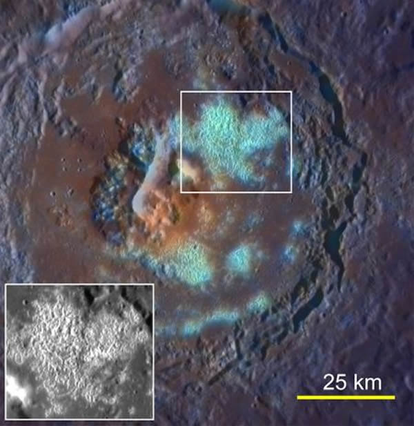 目前科学家们认为的可能解释有很多种,包括火山活动,地下排气活动或者某种物质的升华过程。但是有一点是可以确定的,那就是这些白色似乎总是集中在光照最多的区域,暗示这可能和光照之后的升温加热过程有关。