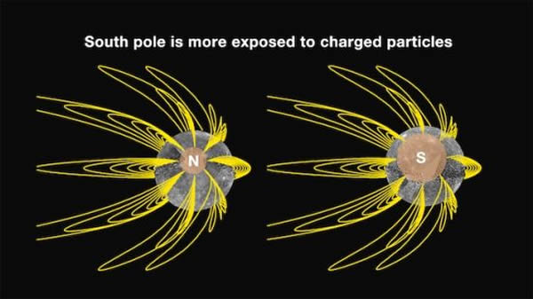 而关于水星的磁场本身,最特别的一点便是它的高度不对称性。其北半球的磁场强度是其南半球磁场强度的3.4倍。了解这一点对于我们推断产生其磁场的内部机制将起到关键性的帮助作用。