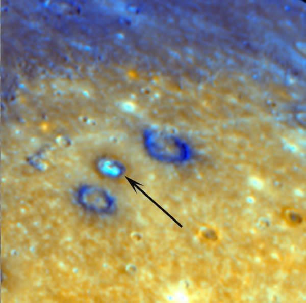 这一陨石坑内部显现的白色特征目前还不能判断究竟是什么,因此也就暂时无法进一步推定其成因。