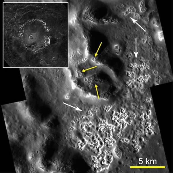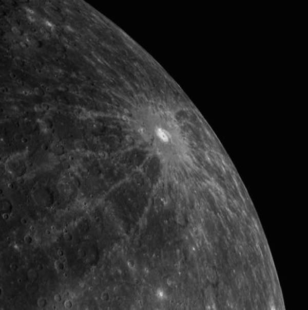 这是水星表面的德彪西陨石坑,这是一颗小行星撞击水星表面时形成的,撞击产生大量碎片四散飞溅,在四周形成大量二级陨石坑,并产生这些新鲜的散落物质。由于德彪西陨石坑看上去相对较明亮,因而它被认为年代较新,这是因为在太阳风的轰击下,水星表面的物质会随着时间推移而逐渐风化并逐渐变得暗淡。信使号的探测表明陨石的撞击以及火山活动都在水星的早期演化历史中扮演着重要的作用。