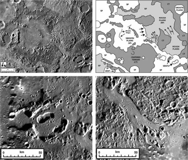 水星北半球大约6%的土地是平原。这里平缓的地貌上点缀着相对数量有限的陨石坑,说明这一地区的地质年代相对年轻,可能是在最近发生的火山活动中形成的。