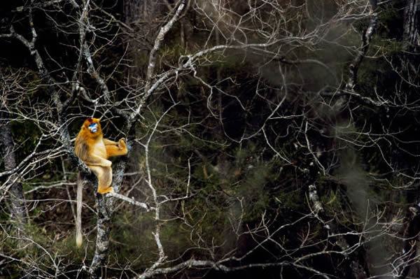 与大熊猫一样,金丝猴野生中国特有种,秦岭是金丝猴生活的最北限,主要是川金丝猴。在佛坪自然保护区里,一只红颈蓝面、全身披着细密柔软的金色长毛的川金丝猴靠在树枝间休息
