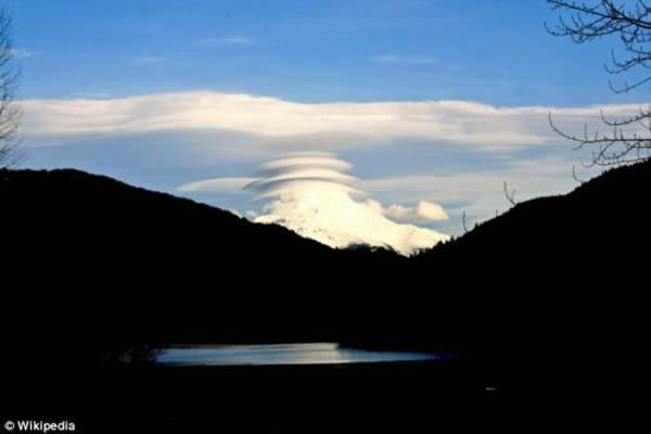 乍一看,它像是登上一艘巨大飞碟的外星人,或者是这座山脉正在设法腾空飞起,努力打破声障。但事实上这个与众不同的景观只是一种非常罕见的云团结构,名叫“荚状云”或者“帽子云”。